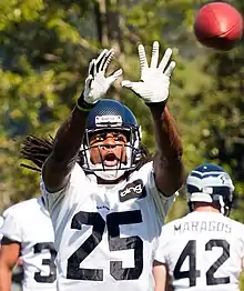 Richard Kevin Sherman[1] (born March 30, 1988) is a former American football cornerback who played 11 seasons in the NFL. Sherman played college football at Stanford, beginning his career as a wide receiver before moving to cornerback as a junior.[2] He was drafted by the Seattle Seahawks in the fifth round of the 2011 NFL Draft. He was selected to the Pro Bowl five times and voted All-Pro five times, including three times to the first team, and led the NFL in interceptions in 2013, when he also helped the Seahawks win their first Super Bowl. Sherman is regarded as one of the greatest cornerbacks of all time.[3][4]