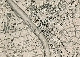 Although a ferry had almost certainly existed at the site of the present-day bridge since Norman times,[5] the earliest known crossing of the river at Richmond dates from 1439.[6] The service was owned by the Crown, and operated by two boats, a small skiff for the transport of passengers and a larger boat for horses and small carts;[4] the Twickenham Ferry, slightly upstream, was also in service from at least 1652.[7] However, due to the steepness of the hill leading to the shore-line on the Surrey side neither ferry service was able to transport carriages or heavily laden carts,[8] forcing them to make a very lengthy detour via Kingston Bridge.[4]