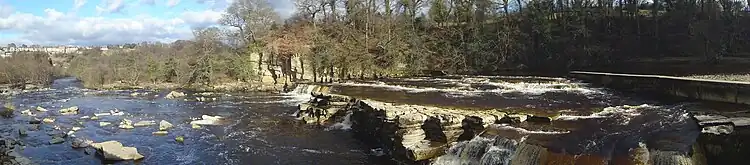 Richmond Falls are a series of waterfalls along the River Swale, they are situated at grid reference NZ173006 near to the town centre of Richmond, North Yorkshire.[1] They are one of, if not the last waterfalls on the Swale before the river reaches the lower country grounds of the Vale of Mowbray, their normally medial size can be affected easily, much like the rest of the Swale, by heavy rain and flooding, making for dramatic viewing. Because of the steep nature of the rocks, the falls are a barrier to fish passage upstream.[2]