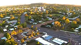 Aerial view of Richmond Hill, looking from the intersection of Bridge Street with Hackett Terrace (lower right) and then SSW along the curve of Bridge Street with Mosman Street in the centre of Charters Towers and Towers Hill in the distance