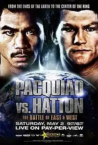 Manny Pacquiao vs. Ricky Hatton, billed as The Battle of East and West, was a professional boxing match for the IBO and The Ring light welterweight championship between Manny Pacquiao of General Santos, Philippines and Ricky Hatton of Manchester, United Kingdom. The bout was held on 2 May 2009 at the MGM Grand in Las Vegas, Nevada, United States and drew 1.75 million pay-per-view buys.[1]