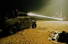 The angle of departure, both vertically and horizontally, is difficult to calculate or predict due to the many variables involved, not the least of which is the deformation of the bullet caused by its impact with the surface it strikes.[9] Probability of ricochet is highest from surfaces approximately parallel to the axis of bullet movement, and grazing ricochets typically depart the surface at a smaller angle than the angle of incidence (or approach).[2] Probability of bullet penetration increases as the axis of bullet movement becomes perpendicular to the target surface; but penetration may create a depression or crater within which the bullet may ricochet more than once, possibly following the arc of the crater floor to depart the crater at a greater angle from the original surface than the angle of incidence.[10] In an extreme case, a strong, cohesive bullet striking a nearly perpendicular elastic surface may ricochet directly back at the shooter.[11][12] This situation is sometimes observed when hardened armor-piercing bullet cores fail to completely penetrate steel plate. The United States Army noted increased ricochet range after adopting the M855A1 green bullet with a larger steel core than the M855 bullet it replaced.[13] Buckshot and subsonic bullets may be similarly reflected from rubber vehicle tires.[14]