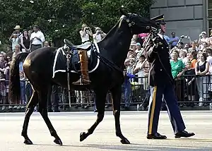 A riderless horse is a single horse without a rider and with boots reversed in the stirrups, which sometimes accompanies a funeral procession. The horse, sometimes caparisoned in black, follows the caisson carrying the casket.[1] A riderless horse can also be featured in parades (military, police or civilian) to symbolize either fallen soldiers, fallen police officers or deceased equestrian athletes.[2] A motorcycle can be used as a substitute for a horse though such practice is very rare.[3][4]