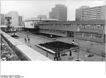 The Rieth is connected to the Erfurt city centre by Erfurt Stadtbahn tram lines 1 and 6. The name Rieth frequently appears in Thuringia as a component of place names. These are river floodplains reclaimed in the Middle Ages, which had previously become marshy and had been drained. Today's Rieth district is also located in such a floodplain between the Gera River in the west and the river Schmale Gera in the east. The Rieth was the first GDR housing estate with a complex centre in its centre, but the Johannesplatz was the first prefabricated housing estate to be built in Erfurt in 1965.