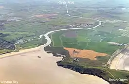 The river then continues northwest past Wedmore Moor and through Oxmoor, Stoke Moor and Monk Moor. The river passes through the settlement of Lower Weare and on to the south of Loxton. From this point until it passes between Uphill Cliff and Brean Down, then reaches the coast at Weston Bay, the river demarcates Sedgemoor from North Somerset.
