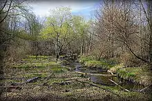 Ingersol Creek at Novi. Note riparian buffer. Just outside the frame are a rail line and residential, industrial, and public recreation facilities