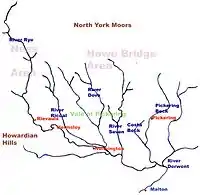 The river rises at Rye Head near Snilesworth Lodge on Snilesworth Moor in the Cleveland Hills and collects the River Seph which flows along Bilsdale. It passes Rievaulx Abbey and enters the Vale of Pickering at Helmsley. In its eastward course from Helmsley, the Rye receives the River Dove from Farndale which has previously added the Hodge Beck from Bransdale. Hodge Beck is partly swallowed by the limestone aquifer in Kirkdale and issues again further down the valley. Kirkbymoorside is on the River Dove which, like Hodge Beck has a partly subterranean course. Rosedale sends down the River Seven which comes by Sinnington to join the Rye. The steep-sided Newtondale gives Pickering Beck which joins the Costa Beck before it enters the River Rye just before its mouth into River Derwent.[1]