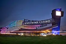 Riverwind Casino is a casino located in Norman,Oklahoma that opened in 2006. The 219,000 square feet (20,300 m2)[2] casino, owned and operated by the Chickasaw Nation, is one of the largest in the state. In addition to the casino floor, the facility also has two restaurants, a lounge, a food court, several bars, valet parking and a 1500-seat theatre that hosts concerts. Riverwind also opened a 100-room adjoining hotel in February 2009. The casino is located in at the Interstate 35/State Highway 9 west junction.