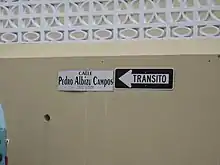 In Puerto Rico, the municipal road is not a fifth network of the National Highway System of Puerto Rico. A municipal road or highway (Spanish: carretera municipal) refers to any public roadway that is not marked with a Puerto Rico National Highway network system road marker.[31] Unlike state roads, which are signed with numbers, municipal roads are signed with names, such as Calle Pedro Albizu Campos.[31]