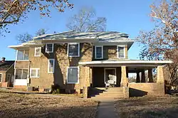 The Robert Atlas Harper House is a historic house at 201 North Main Street in Greenwood, Arkansas. Built about 1915, the house is a little-altered American Foursquare with a distinctive exterior made of a rough stone aggregate mixed with cement, creating a tabby-like rough stucco finish. Its front porch is also uniquely designed, with tapered square piers out of battered stone set atop a half-wall of the same material. The house was built by W. Calvin Stanfill, a local contractor who specialized in stone masonry work.[2]