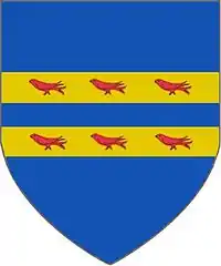 Arms of Robert Burdet: Azure, two bars or each charged with three martlets gules [1][lower-alpha 1]