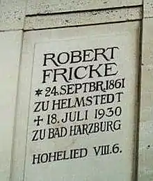 In 1893 in Chicago, his paper Die Theorie der automorphen Functionen und die Arithmetik was read (but not by Fricke) at the International Mathematical Congress held in connection with the World's Columbian Exposition.[1] From 1894 to 1930 Fricke was professor of Higher Mathematics at the Technische Hochschule Carolo-Wilhelmina in Braunschweig.