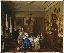 In 1866, English painter Seymour Joseph Guy created The Contest for the Bouquet: The Family of Robert Gordon in Their New York Dining-Room which features three of the Gordon children after having finished their breakfast and vying for a "corsage before setting off for school." Besides his family, the painting depicts Gordon's dining room, decorated in the up-to-date Renaissance Revival style, at his home at 7 West 33rd Street.[17][18]