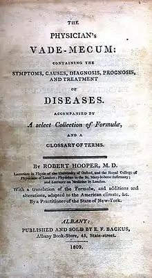 - A Compendious Medical Dictionary, containing an Explanation of the Terms in Anatomy, Physiology, Surgery, London, 1798; 6th edit., 1831; numerous American editions were issued. The edition of 1811 was issued as a new edition of John Quincy's Lexicon Medicum, a work which had gone through thirteen editions, largely copied by Hooper. Subsequent editions bore the title Lexicon Medicum, or Medical Dictionary, without reference to Quincy. OL 5228057W