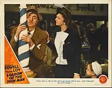 Kalloch left Columbia Pictures in early 1941,[54] and by May was working for Metro-Goldwyn-Mayer (MGM).[55] The reason for his employment seems to be that his designs strongly resembled those of Adrian, MGM's chief fashion designer,[18] with whom Kalloch had maintained a close friendship since Adrian's student days at the New York School of Fine and Applied Arts.[56] Adrian then left the studio on September 5, 1941, to open his own fashion firm.[57][58][lower-alpha 2] During his short tenure at MGM, Kalloch designed costumes for Hedy Lamarr[63] in H. M. Pulham, Esq.,[36] White Cargo,[64] and Crossroads;[65] Myrna Loy in Shadow of the Thin Man;[21] Judy Garland in Babes on Broadway;[54] Ann Sothern in Ringside Maisie and Maisie Gets Her Man;[54] Eleanor Powell in I'll Take Manila[66][67] (released under the title Ship Ahoy);[68] Norma Shearer in We Were Dancing[69] and Love Me Not[70][71] (released under the title Her Cardboard Lover);[72] Lana Turner in Somewhere I'll Find You;[73] Veronica Lake in This Gun For Hire;[74] Rosalind Russell in Design for Scandal;[75][76] 18 sparkling white gowns for Jeanette MacDonald in her first non-period piece film, Shadow of a Lady[76][77][78] (released under the title Cairo);[79] and Greer Garson in Random Harvest[15] and Mrs. Miniver;[80] In an unusual endeavor, Kalloch also designed the drag costume for Mickey Rooney in 1941's Babes on Broadway.[63]