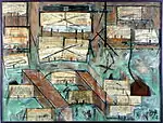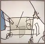 His leaded “Compositions” are more akin to paintings or drawings than to traditional stained glass. They have been described as narratives at once “spontaneous, lyric, grotesque and humorous.”[7] Biomorphic forms, quirky lines and childlike scribbles, at times derived from his son's crayon drawings, add to the surreal atmosphere.[8] A crossed-out triangle in one of the works “appears a casual enough gesture, but the assumption of nearly a thousand years of stained glass, that the nature of line is to delineate shape, is challenged by that childlike scrawl.” [9] These Compositions “quietly demolished more than a few of the restrictive preconceptions surrounding his media.”[1]