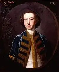 • Henrietta Knight (1729–1763). His only daughter Henrietta, who also predeceased him, married firstly Charles Wymondsold, son of Matthew Wymondsold of East Lockinge and Putney, a speculator in the South Sea Company. Having run away from him, and been divorced in 1754, Henrietta married secondly the Hon. Josiah Child (d. 1760), an officer in the Royal Navy, the younger son of Richard Child, 1st Earl Tylney, of Wanstead House, Essex, son of the very wealthy Sir Josiah Child, governor of the East India Company.[15] She gave birth to their son, Josiah, shortly before her divorce came through. The younger Josiah was brought up by Lord Tylney, but died in Florence in 1774. Mrs Child then had an affair with Louis-Alexandre de Grimoard de Beauvoir, Comte de Roure and died giving birth to their son.[16]