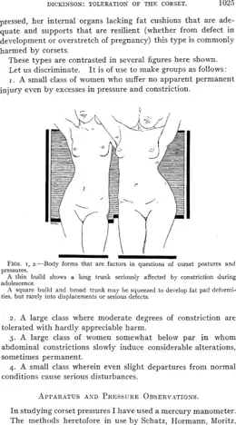In 1910, Dickinson published "Toleration of the corset: Prescribing where one cannot proscribe", in which he investigated the medical effects of corsets, including the displacement and deformation of internal organs. He found that, while some women could wear these garments without evident damage, the vast majority of users sustained permanent deformations and damage to their health.[3]