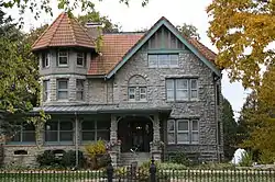 Robert Lutz House, sometimes referred to as Lutz Mansion, is a home located at 1449 Knapp Street in Oshkosh, Wisconsin, United States. Situated at the corner of Knapp Street and South Park Avenue, it was the home of Robert Lutz, owner of Lutz Brothers Stone Quarry. The home was designed by architect William Waters and built by C.R. Meyer Construction Company using stone from the Lutz-owned quarry.[3] Built in 1910 on 1.6 acres of land, the structure also served as the quarry master's office, complete with separate entrance. The home is now owned by the Gafner Family Trust, Rebecca and Douglas Gafner II as co-trustees.