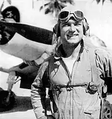 A member of VMF-215 flying the F4U-1 Corsair, the ace was shot down twice. The first time, a Zero caught him over Bougainville Island. Bringing his plane down on the ocean, he paddled for six hours in a rubber life raft before being rescued by the USS Sigourney (DD-643). His second and fatal crash occurred one day before his twenty-fourth birthday. He was last seen on February 3, 1944, when his plane crashed into the sea after a cancelled (due to overcast) fighter sweep mission over Rabaul, New Britain. He was attempting to destroy a lighthouse on Cape St. George, Southern New Ireland, that often gave the fighter group trouble by firing flak at the fighter group as they passed the lighthouse. His squadron leader Capt. Harold L. Spears watched as he attempted to land his damaged plane in the water during rough seas. His plane cartwheeled when one of the wings grabbed a wave, and the plane disintegrated. He had no time to escape the cockpit, thus sank with his plane. He was subsequently declared killed in action.[2] He has cenotaph memorials at Manila, Philippines and Newton, Massachusetts.[3]