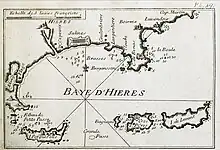 Maunsell entered the Royal Navy, in February 1799, as First Class Volunteer,[4] on board the Mermaid, 32 guns, commanded by his relative, Captain Robert Dudley Oliver,[3] fitting for the Mediterranean; where he attained the rating of Midshipman in July 1800, removed in 1801 to the Maidstone, 32 guns, Captains Richard Hussey Moubray and George Elliot, and continued actively employed until the end of 1804.[4] During that period to be made a participator in many cutting-out affairs; but particularly on 11 July 1804, when, holding the rating of Master's Mate, he served with the boats of the Maidstone, Narcissus, and Seahorse, 10 in number, under the orders of Lieutenant John Thompson,[lower-alpha 1][14] and assisted at the capture of 12 settees, lying at La Vandour, in the Bay of Hières, after a conflict, in which the British, encountered by a tremendous fire of grape-shot and musketry, as well from the vessels themselves as from a battery and the houses of the town, sustained a loss of 4 men killed and 23 (including himself, severely) wounded.[lower-alpha 2][4]