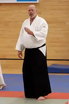 On March 30, 1986, he traveled to Japan to train at the Yoshinkan hombu dojo with an introduction letter from Kimeda and gifts for the instructors and uchi deshi as is customary. Mustard described the first sessions he watched of Gozo Shioda's black belt class, as a "magic class".[1] In May of that year, he enrolled into the senshusei training program.[1] He trained for 9 years at the hombu dojo under Gozo Shioda's leadership. Mustard does not consider himself to be a direct student of Gozo Shioda, because his instruction was mainly under Takafumi Takeno and Tsutomu Chida.[2] One year after Gozo Shioda's death, Robert Mustard and his wife Carol left Japan and settled in Vancouver, BC and opened the Aikido Yoshinkai Burnaby dojo in Burnaby, British Columbia. Robert Mustard attained the rank of Nana-dan (7th degree black belt) in December 2006, and was awarded the title of Shihan in August 2011. He was awarded Hachi-dan (8th degree black belt) by the Yoshinkan Honbu Dojo in November 2014.