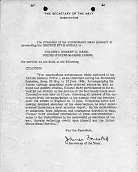 Following five months of training, 1st Marine Division participated in the Battle of Okinawa at the beginning of April 1945. Bare took part in the amphibious landing and following the deployment of his headquarters ashore, he coordinated divisional units until the end of the operation. He distinguished himself again and was decorated with the Legion of Merit with Combat "V" for the training of the division and for his service during the battle.[7][8][2]