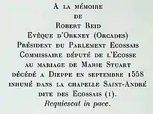 In a letter dated 30 October 1557, Henry of France requested that the Scottish parliament send commissioners to prepare for the wedding of Queen Mary to the Dauphin of France. Robert Reid was appointed as one of the nine commissioners to negotiate the wedding treaty.[54] [note 3] On 6 February 1558—the day that he embarked for France—Reid concluded his last will and testament that allowed for a sum of 8000 merks to be used for the formation of a college in Edinburgh.[note 4][note 5] Reid embarked on one of the ships of a small flotilla that had been assembled to transport the commissioners, personages with their horses and gifts for the wedding. The weather was poor and even before they had left Scottish waters, one of the ships transporting the horses foundered and sank—another ship whose master was a Captain Watterton was wrecked as it approached the French coast with the loss of many gentlemen and valuable cargo.[57] Reid and his fellow commissioner, the Earl of Rothes, were themselves shipwrecked near Boulogne and were rescued by a French fishing boat.[5] On 11 April Bishop Reid and his fellow commissioners agreed on the marriage contract that protected Scotland's rights—this contract prevailed despite an attempt by the French to subvert the outcome by obtaining an agreement directly with Queen Mary to Scotland's detriment.[58] Mary's wedding took place on 24 April at Notre Dame Cathedral—the scene of her father's wedding to Madeline twenty-one years earlier.[59] An altercation took place between the council of France and the Scottish commissioners when the French demanded that the Regalia of Scotland be immediately sent to France so that the Dauphin could be crowned King of Scotland. Reid and his fellow commissioners refused by explaining that they had no mandate from the parliament of Scotland to agree to such terms.[60] Displeased with this response, the French king prepared a letter of persuasion to the regent that two of the commissioners would deliver. In the meantime, the other commissioners were kept back until the French were certain that the letter was successfully delivered—only at this point could Reid return to Scotland.[61] Reid arrived at Dieppe at the end of August and started for home, only to be driven back in a gale, but by this time the bishop and four other commissioners were very ill. They all died but Reid was the first on 6 September 1558 and was buried in the Chapel of St Andrew in the Church of St Jacques, in Dieppe.[62]