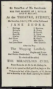 - ↑ National Library of Australia, Digital Collections: Item from "For the benefit of J. Butler and W. Bryant": at the Theatre, Sydney on 30 July 1796