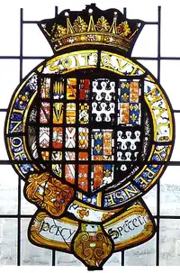 17th century stained-glass escutcheon in the Percy Window, Petworth House, Sussex, showing arms of Henry Percy, 5th Earl of Northumberland (1477–1527), KG, (with 16 quarterings) impaling quarterly of 4: 1&4: Sable, two bars nebuly ermine (Spencer of Spencer Combe), 2&3: The Royal Arms of England within a bordure compony argent and azure (Beaufort). The two halves of the escutcheon are inscribed below: Percy (dexter) and Spe(n)cer (sinister)