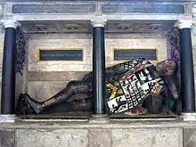- ↑ Date of death of Robert depicted in the effigy is known to be 1570, his date of birth is given in the verse inscription "Nine lustres had not passed nor was he wed, Ere hurrying fate laid Robert Steward dead"; a lustrum in ancient Rome was a period of 5 years, thus he lived for less than 9 lustra, less than 45 years, so died aged 40-44, therefore born 1526/30