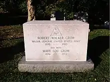 Born in Sibley, Iowa to Nellie (née Walker) and John Thomas Grow. His mother died when he was two years old and Grow went to live with his paternal grandparents, as his father went to Canada to work. He graduated from the University of Minnesota in 1916.[1] He married Mary Louella Marshall (1896-1974), daughter of Willamina H. "Willie" (née Robertson) and J Walter Marshall, of Cleveland, Tennessee on November 5, 1917, in Hamilton, Tennessee.[2] They had two sons, Robert Marshall and Walter Thomas, both attendees of the United States Military Academy at West Point, New York. They had an additional child die as a one-day-old in Brownsville, Texas.[3]