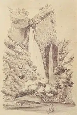 Hanapēpē Falls, Kauai, graphite drawing on paper by Robert Wilson Andrews, 1857