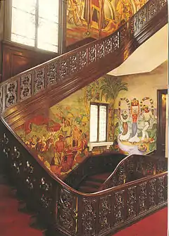 In 1933 Cueva del Río began work on the Embassy frescos, with the themes: La Fiesta de las Flores y Frutas en Tehuantepec (Flowers and Fruits party in Tehuantepec), also called Fiesta Tehuana; Los Volcanes, Fraternidad Panamericana (The volcanoes and Pan-American fraternity). The fresco created great expectations in Mexico. "El Nacional" newspaper published a head note on June 19, 1934, about the visit of the artist back to Mexico. "Now is among us the great Mexican painter Roberto Cueva del Río" with a deeply exaltation, pointing that: "The fresco that he is creating in the embassy will be the biggest worldwide, due the walls around the central stair has a picture continuity and ideological solution from the floor to the ceiling. Cueva del Río makes next to José Clemente Orozco, Diego Rivera and David Alfaro Siqueiros, the quadrangle of the best paintbrush artists with real work outside of Mexico". In this mural we can see Carlos Fuentes in his youth.