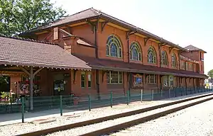The Rock Island Depot and Freight House is a two-story railroad station and adjacent one-story freight house from the turn of the 20th century. It was constructed in 1899 directly besides the Illinois River in the American city of Peoria, Illinois. The depot and freight house are one of Peoria's last remaining historic reminders of the importance of passenger trains in the city's past, the other being the newer (1967) Rock Island station at 121 Morton Street now owned by the City of Peoria.[1] The depot was built by the Chicago, Rock Island and Pacific Railroad as the terminus of a major branch line that delivered significant goods and passengers to Peoria. The 1900 opening of the depot was attended by "throngs of populous;" at its height before the depression of the 1880s, Peoria was a transportation hub.[1] The station's clock tower was removed in 1939.[3] The buildings were listed on the U.S. National Register of Historic Places in 1978.[2] The last Rock Island train out of the station was the Peoria Rocket in 1978, of the company's Rock Island Rockets series.