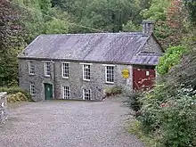 During the Industrial Revolution the Teifi Valley became the centre of the Woollen industry in Wales, employing thousands of weavers, spinners, dyers, knitters, drapers and tailors.[3] The river and its tributaries powered dozens of mills, and sheep in the surrounding grassland supplied fleeces to be made into woollen products.[4] Rock Mill was built in the 1890s by the great grandfather of the present owner.[1] The two-storey mill is built of stone, with flagstone floors and low ceilings.[3] The mill has been operated continuously by the same family since its foundation as a spinning and weaving mill. Few changes have been made in that period.[1] The mill is now the only commercial woollen mill powered by water that is still operating in Wales.[5]