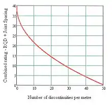 The details for calculating RMR are given by Edumine[4] and provide a series of tables for RMR determination while the latest charts for the same purpose are given in the references and further reading. In particular, the charts enclosed here for the RMR parameters intact rock strength and the combined parameters RQD and discontinuity spacing (represented by the number of discontinuities per meter), show the advantage of using the charts for better accuracy, rather than relying on the tables which show the average ratings for the ranges of each RMR parameter. The lump ratings for each parameter makes it difficult for less experienced personnel to determine the RMR accurately. There are also subjective parameters like roughness and weathering which may pose difficulty in rating assignment. Kundu et al. have proposed continuous functions for each parameter of RMR89 and RMR14 including roughness and weathering.[3] They have also developed a software "QuickRMR" based on the continuous functions to calculate RMR with quantitative inputs.