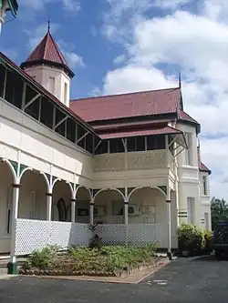 The southwest elevation, fronting Agnes Street, consists of two gable sections with the area between enclosed at ground level and housing kitchen and laundry facilities. To the south of this, and slightly recessed, is the Assembly Hall end elevation, which has a gable parapet with a rounded apex and a series of tall casement windows, the central one of which has an arched fanlight, with timber shutters. Stepping back from this element is the reconstructed open verandah.[1]