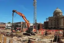 Prior to its construction, the two existing commercial buildings at 212 and 214 Quay Street were demolished, including the building known as the Rockhampton Enterprise Centre. Deputy Prime Minister Michael McCormack, Capricornia MP Michelle Landry and Rockhampton Region mayor Margaret Strelow ceremonially commenced the demolition work at the site on 14 August 2019.[5] Demolition work was carried out at the site until December 2019 when it transitioned from a demolition site to a construction site with structural work commencing in January 2020.[6]