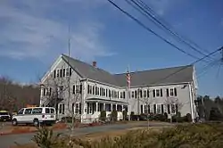 The almshouse is located south of Rockland's village center, on the east side of Spring Street, a major north-south artery in the southern part of the town. The main building is an L-shaped 2+1⁄2-story wood-frame structure, with a gabled roof, clapboard siding, and foundation of brick and rubblestone. The east–west portion of the L has a single-story hip-roof porch extending on its southern facade, with original turned posts and balustrade. This facade is five bays wide, with the main entrance at the center bay. The west-facing gable end is three bays wide, with two sash windows in the gable, three windows on the first level, and two windows flanking a modern emergency exit on the second. The north–south portion of the building presents five bays to the west, although they are not symmetrical.[2]