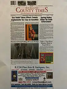 The Rockland County Times began publication in October 1889.[2] In 1998 the paper declared bankruptcy and was purchased by Peter Sluys, a former editor of other weekly newspapers.[3] The following year, the Rockland County Times was designated one of the official newspapers of Rockland County, for purposes of publication of legal notices and announcements.[4]