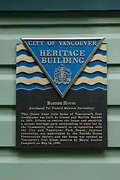 Roedde's family home was completed in 1893.[1] The house's alleged architect, Francis Rattenbury (1867-1935), was an ambitious English immigrant. He also designed The Empress Hotel and Vancouver's 1910 provincial courthouse (currently the Vancouver Art Gallery). The Roedde House's asymmetrical plans, verandas and turret are all features of the Queen Anne Revival style. Both the interior and exterior of the house are made of cedar and fir, due to the cheap availability of lumber at the time.