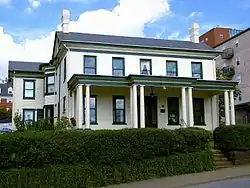 Rogers House is a historic home located at Morgantown, Monongalia County, West Virginia.[2] It was originally built about 1857 and is one of the last remaining residences from this time period in downtown Morgantown. The building is a two-story, five bay brick and wood frame dwelling in the Classical Revival style. The original section of the house is in brick, whereas the addition, designed by noted Morgantown architect Elmer F. Jacobs and built in 1905-1906 is wood frame. Jacobs is also responsible for the interior design. It sits on a rough-faced coursed ashlar stone foundation. It features a front porch with four sets of triple wooden, Tuscan order columns. It was the home of the Rogers family, pioneer settlers of Morgantown. It has been the home of West Virginia University's Campus Ministry Center since 1984. It was listed on the National Register of Historic Places in 1984. It is located in the Downtown Morgantown Historic District, listed in 1996.