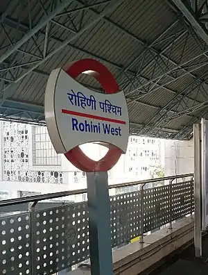 Rohini West (also known as Rohini Sector 6, 10) is a metro station of the Red Line of Delhi Metro.[1] It is located in Sector 6 & Sector 10 of Rohini in Delhi, India. The station was inaugurated on 31 March 2004. The station is located just in front of Unity One Mall, Rohini. To provide seamless connection, the mall and the station have been integrated with Skywalk between the station building and the mall near gate no. 1 which allows travellers to directly enter the mall without exiting through the exit gates and vice versa.