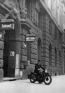Postman on BMW motorcycle in front of the Haupttelegrafenamt on Oranienburger Straße. Sign "Rohrpost" next to entrance (1950)