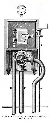 Functional principle of a pneumatic post terminal apparatus with air exchange cock (around 1900): The barrel tube D opens into the chamber A, whose door B with a rubber seal can be closed airtight by the pressure lever C. The chamber can be connected to the pressure pipe O or the suction pipe P by the air exchange cock F. It is moved by the hand wheel G with a pointer to the positions indicated on the brass plate of the table top N. The chamber can be ventilated by means of the air cock I via the external air pipe K. The pressure gauge M is used to check the air pressure.