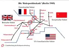 In January 1949, the Soviet side cut off the pneumatic post connections between the Soviet sector and the western sectors of Berlin at the sector borders (so-called pneumatic post blockade), thus aggravating the postal situation. As the Berlin pneumatic delivery network had historically been developed from the Haupttelegrafenamt Berlin, thus the centre of the entire network was now located in the Soviet sector.