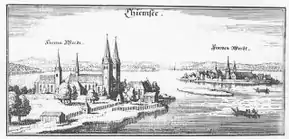 Herrenchiemsee (left); Engraving by Merian, c. 1644