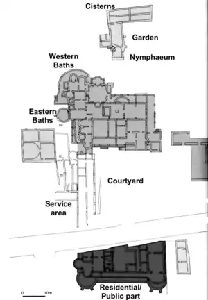 To the west of the baths is a monumental nymphaeum with cisterns which lay to the south of a large garden.