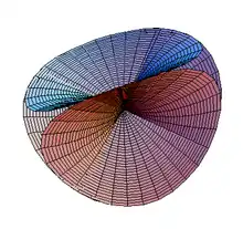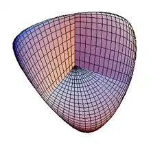 In mathematics, the Roman surface or Steiner surface is a self-intersecting mapping of the real projective plane into three-dimensional space, with an unusually high degree of symmetry. This mapping is not an immersion of the projective plane; however, the figure resulting from removing six singular points is one. Its name arises because it was discovered by Jakob Steiner when he was in Rome in 1844.[1]